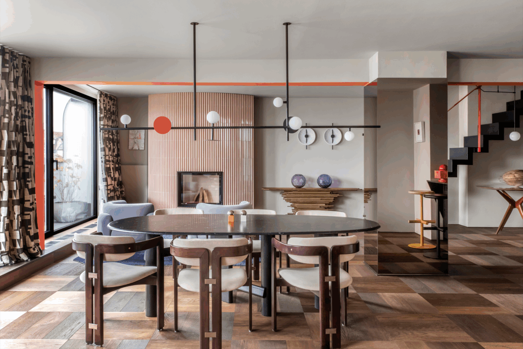 Der Ausbau zweier Dachgeschosse ließ in der Münchener Kurfürstenstraße eine exklusive Penthouse-Wohnung entstehen. Arnold / Werner war sowohl für die Innenarchitekturplanung der 400 Quadratmeter großen Wohnung als auch für die Sanierung von Fassade und Treppenhaus verantwortlich.